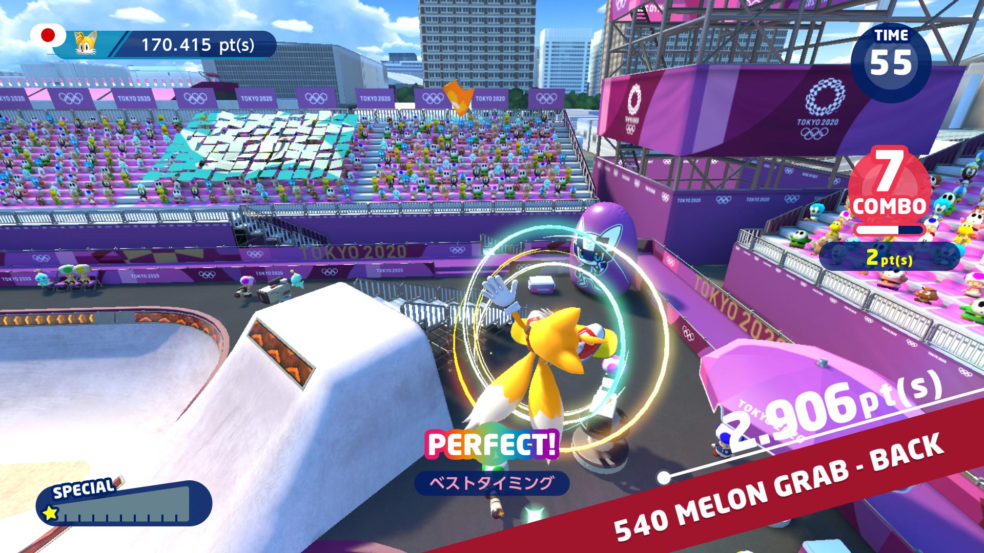 「2020东京奥运」中新增加的竞技项目之一,滑板。通过完成各种花式动作,来获取分数。对准坡岸和斜坡上设置的标志的箭头方向,完成跳跃或是滑行、碾磨等等花式动作能点亮灯光。点亮标志,或是完成新花式动作会取得奖励分,所以为了点亮尽可能多的标志,路线的选择非常的重要。通过完成大量的花式动作蓄满特殊槽,可以发动高分值的特殊花式动作。